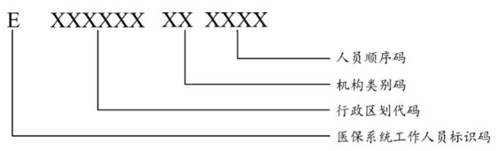 第1部分:醫(yī)保系統(tǒng)工作人員標識碼,用1位大寫英文字母“E”表示。