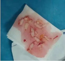 橫切子宮,發(fā)現右側宮腔靠近宮角處有少許脫模樣殘留