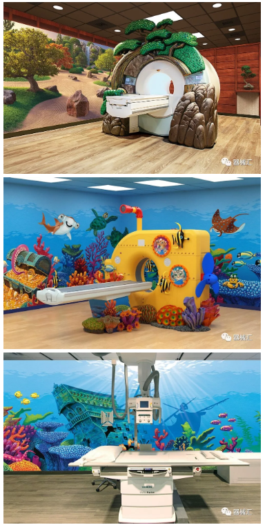Dream Think Imagine(DTI)和Character Farms都是提供此類產(chǎn)服務(wù)的公司,他們專門制作3D外觀,像皮膚一樣包裹在影像設(shè)備上,把設(shè)備變成幾乎認不出來的物品。無論是為兒童建造的城堡主題,還是為成人營造的顏色和照明交互的良好氛圍,都可以幫助患者在醫(yī)療檢查中保持更為平靜的情緒。