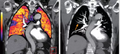 相比傳統(tǒng)成像方式,肺部柔性減影技術(shù)通過人工智能,對平掃數(shù)據(jù)和CT肺動脈血管掃描數(shù)據(jù)進行智能比對,解碼并識別各個器官(肺、氣管、肺動脈、肺靜脈、主動脈等)的空間位置,并在三維空間中進行體素級的柔性配準,從而極大提升了不同序列數(shù)據(jù)的空間位置的一致性。通過肺部柔性減影技術(shù)可得到肺強化碘圖,可以顯示出傳統(tǒng)CTPA圖像看不到的小栓塞病變,提高了栓塞檢出率,其結(jié)果甚至可與SPECT吻合。