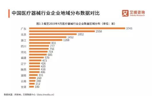 國內(nèi)醫(yī)療器械企業(yè)主要集中在珠三角、長三角以及京津冀環(huán)渤海三個(gè)地區(qū),截至2019年4月,全國共有醫(yī)療器械類企業(yè)約1.88萬家,其中以廣東、江蘇和北京為典型省市,擁有醫(yī)療器械企業(yè)數(shù)量分別為3743家、2558家和1852家。