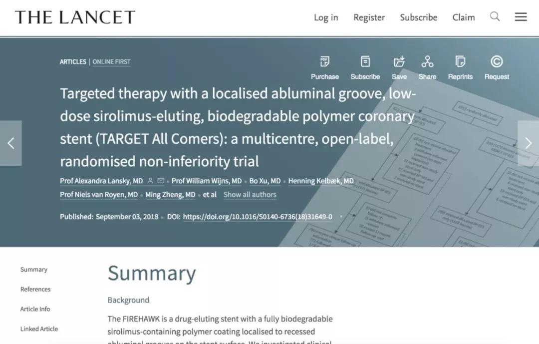 最終的試驗(yàn)結(jié)果證明中國(guó)醫(yī)療器械此行確實(shí)底氣十足?;瘊椬鳛榈谌邢蛩幬锵疵撝Ъ?,證明了患者植入后,受到治療的血管區(qū)域能夠在早期快速愈合,因?yàn)槠鋭?chuàng)新性的微槽包裹藥物、生物可降解聚合物的設(shè)計(jì),以及較低的載藥量(僅需同類產(chǎn)品三分之一的載藥量即可實(shí)現(xiàn)同等療效),安全性大幅增加,可有效減少晚期血栓事件的發(fā)生,達(dá)到了世界頂尖水平。如今,這些結(jié)論登上了《柳葉刀》,中國(guó)智造的“吶喊”迅速在全球醫(yī)學(xué)界傳播開(kāi)來(lái)。