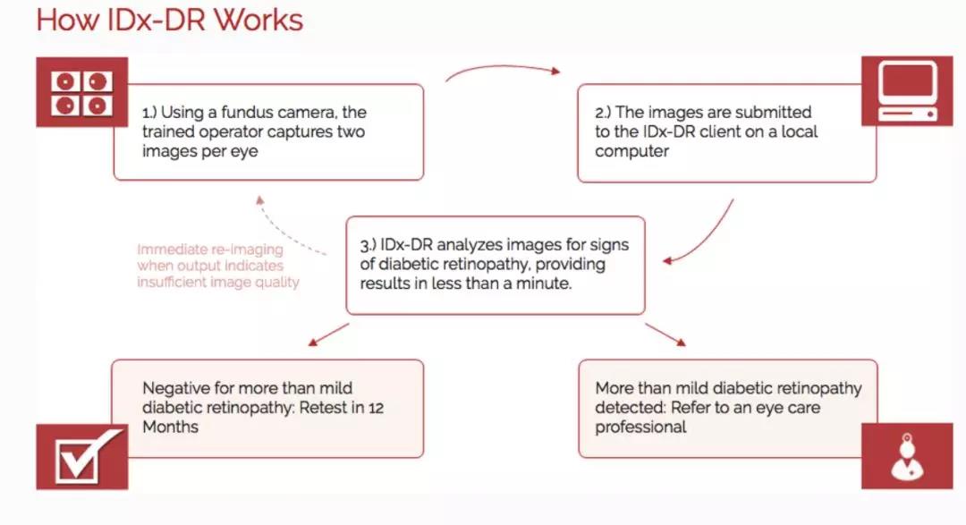 與預(yù)約真人醫(yī)生相比,IDx-DR 真的是太方便簡單了,只需要護士或者醫(yī)生通過使用特殊的視網(wǎng)膜照相機拍下患者的視網(wǎng)膜照片,隨后按照 IDx-DR 軟件的指示上傳圖像,并確定圖像的質(zhì)量是否足夠獲得分析結(jié)果。如果圖像合格,軟件將自動分析(無須專業(yè)醫(yī)生參與)患者是否患有糖尿病性視網(wǎng)膜病變,并將根據(jù)結(jié)果診斷并決策后續(xù)治療。