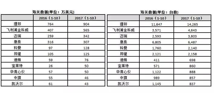 截止2017年10月國(guó)內(nèi)心電廠家出口銷(xiāo)量及銷(xiāo)售額