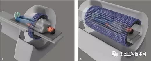 圖A是傳統(tǒng)的PET掃描儀;圖B是全身PET掃描儀(TB-PET)