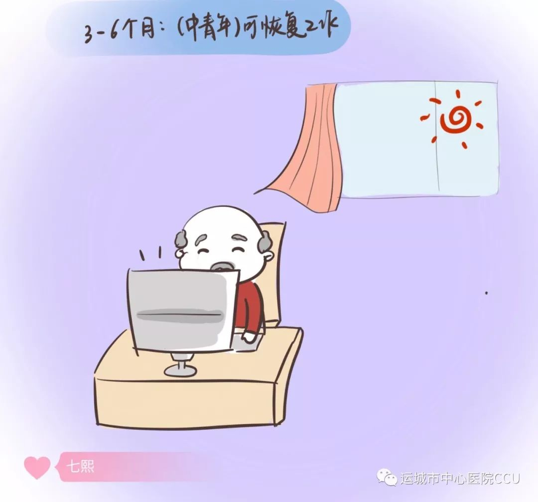 出院后3--6個月:中青年可恢復工作,應注意勞逸結(jié)合。