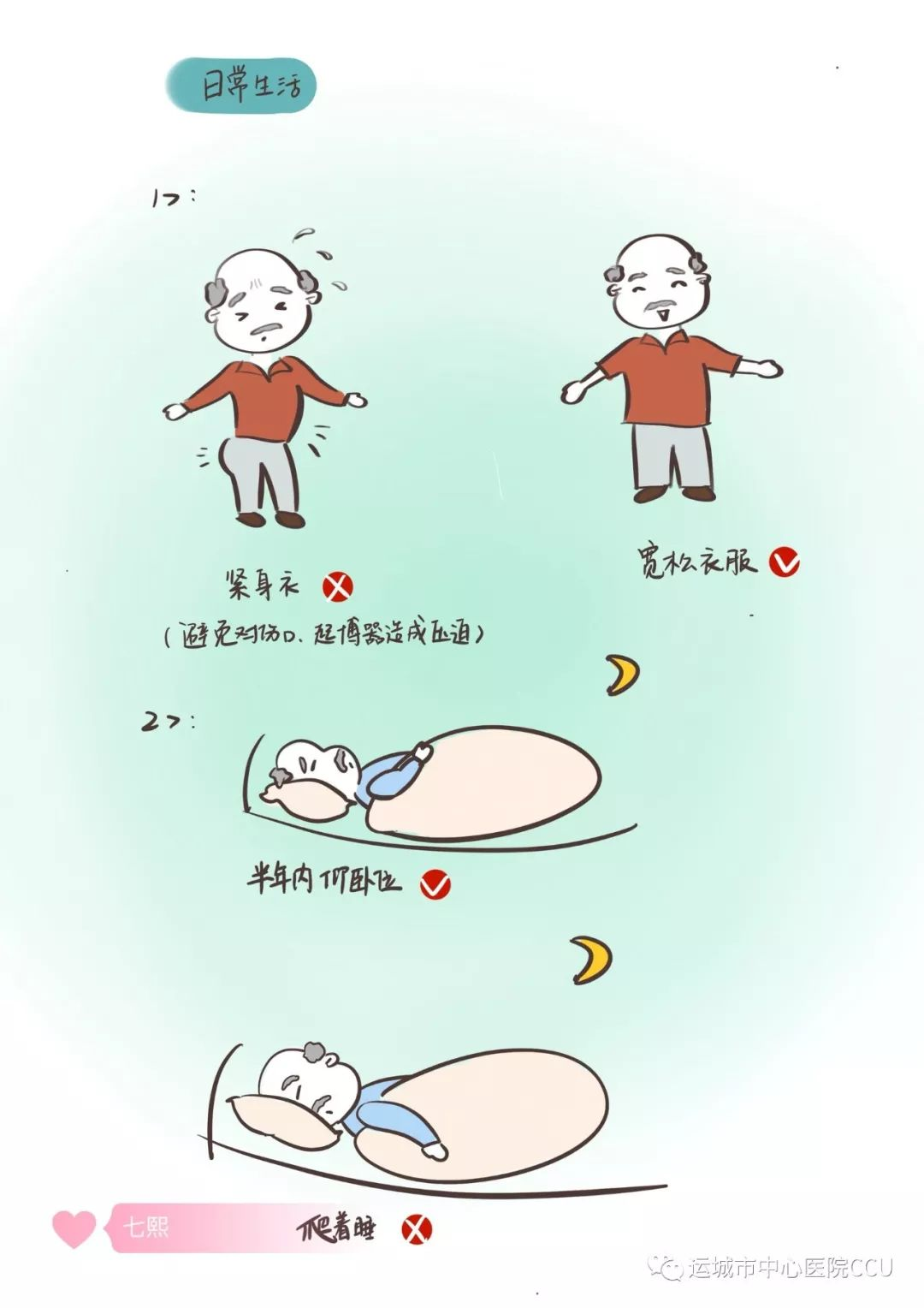 應穿著寬松衣物、休息時保持仰臥位或側(cè)臥位,避免爬下睡對起搏器造成壓迫。