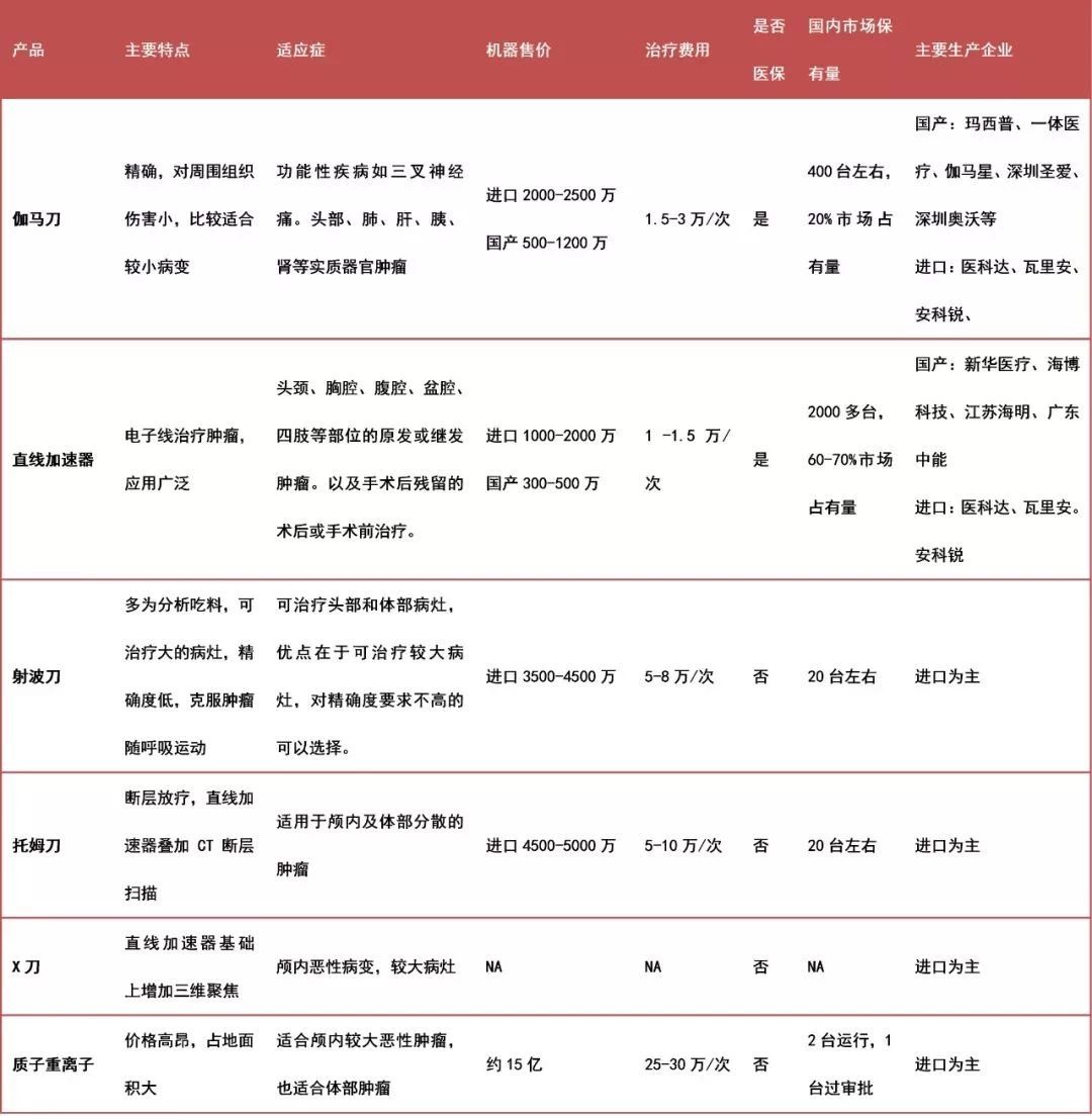 目前的放射治療技術包括伽瑪?shù)?、射波刀、托姆刀、質(zhì)子重離子、EDGE(速鋒刀)無創(chuàng)手術系統(tǒng)。各技術的特點如下。