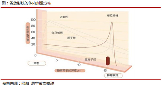 相較傳統(tǒng)的放射方式(γ射線、X射線),質(zhì)子的劑量學優(yōu)勢更加明顯,其具備明顯而獨特的深度劑量特征。其獨特的布拉格峰可使得質(zhì)子束在射入病灶前不釋放出強大的能量,達到病灶末端時能量幾乎剛好釋放完畢,充分保護了腫瘤病灶前后的正常組織。這種特性使得質(zhì)子重離子相對其它射線天然地更為適合用于放療。