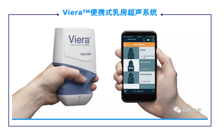 POCUS進入乳房成像的另一個例子是2018年Hologic新推出的Viera?便攜式乳房超聲系統(tǒng)。無線超聲掃描儀為醫(yī)生提供了早期診斷和優(yōu)化臨床工作流程的機會。它可以指導介入程序,如活組織檢查,標記放置和電線本地化。它還可以將乳房圖像傳輸?shù)街悄茉O備或PACS。